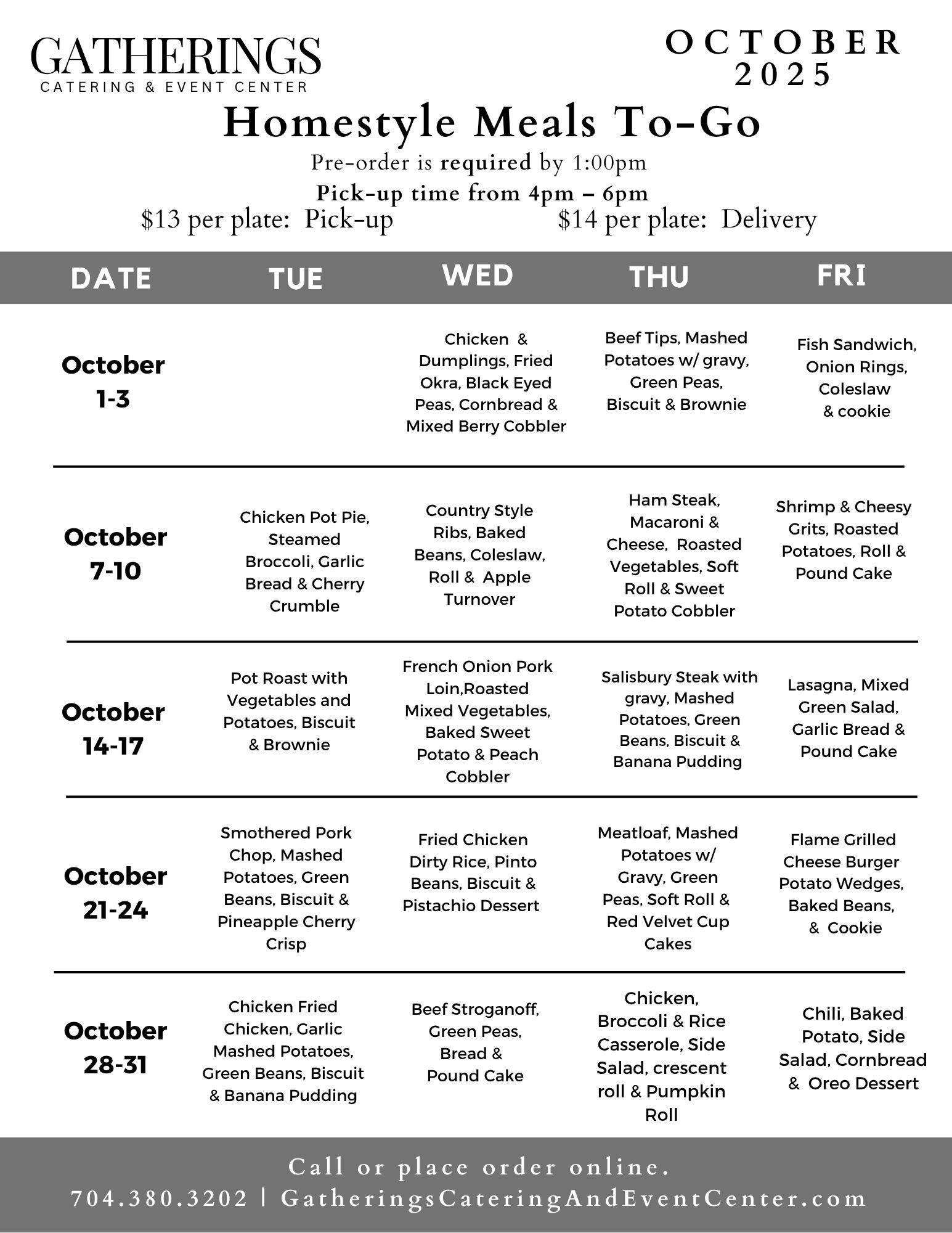 Explore our current menu of delicious selections of homestyle meals to-go. Perfect for those who crave the comfort of homemade food without the hassle of cooking. Whether you need a quick dinner solution or a meal for a special occasion, we've got you covered. Reach out to Gatherings Catering and Event Center and let us know how we can assist with your next meal or event.